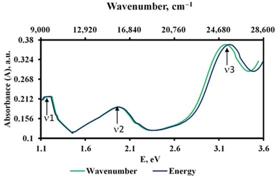 Figure 2 shows the UV-Vis-NIR absorbance spectrum of (C6H11NH3)4[Ni(NCS)6]·2H2O, in methanol, at room temperature, as a function of energy and wavenumber. The spectrum exhibited three distinguished peaks at 1.22 eV (9842.25 cm−1; ν1), 1.97eV (15,898.25 cm−1; ν2), and 3.17 eV (25,575.45 cm−1; ν3), where all these peaks were assigned to spin-allowed transitions. The ν1 peak corresponds to the 3A2g(F) → 3T2g(F) transition, the ν2 to the 3A2g(F) → 3T1g(F) transition, and the ν3 the 3A2g(F) → 3T1g(P) transition, as per the Tanabe–Sugano diagram for octahedral d8 metal ion center [,]. With considering the significance of the interactions between metal and ligand and the separating energy of ~1.0 eV between each two successive absorption bands, we could assign the ν3 transition to ligand–metal charge transfer (LMCT) because it was the strongest in terms of energy and intensity, ascribe the ν2 transition to ligand field (d-d) band, and attribute the ν1 transition to both of d-d and LMCT, where part of LMCT is symmetrically banned for the perfectly octahedral hexaisothiocyanatonickelate(II) and feebly permitted in the real distorted structure of this complex, and hence, ν1 transition was observed stronger and more intense than ν2 transition. Furthermore, the ratio between the positions of two successive peaks was ~1.61, indicating the formation of octahedral Ni(II) complex without tetragonal distortion []. All these observations, inferred from the UV-Vis-NIR spectrum, confirmed the formation of the anionic complex of [Ni(NCS)6]4− and were in agreement with the above FTIR spectrum and with the crystal structure determination by SCXRD.