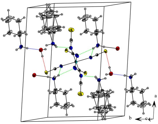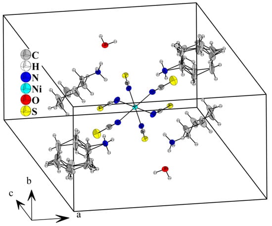Hybrid organic–inorganic compounds, based on the bulky anionic complex of hexaisothiocyanatonickelate(II), [Ni(NCS)6]4−, have also drawn considerable attention due to their promising applications [,,,,,,], depending on the identity of the organic cation. For instance, when the organic cation was 1-butyl-3-methylimidazolium, BMIM+, the resultant compound exhibited ionic liquid nature and reversible thermochromic behavior []. However, when the organic cation was tetrakis(triethylammonium), the eventually produced compound was a useful precursor for the synthesis of anhydrous nickel thiocyanate []. The piperidinium cation resulted in a new compound, which could be used for the preparation of nickel sulfide via thermal decomposition under nitrogen []. Incorporation of triphenylmethylphosphonium cation in a compound with [Ni(NCS)6]4− produced ferroelectric, piezoelectric material, which was suitable for harvesting energy upon its integration, 15 wt.%, in thermoplastic polyurethane []. On the other hand, introducing trimethylammonium gave a suitable material for a dielectric switch, tuned by frequency, as a result of phase transition [].