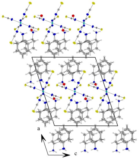 The hexaisothiocyanatonickelate(II) anion displayed a regular octahedron geometry. The angle value of 180° was shown perfectly linear for N—Ni—N octahedron axis, while marginal deviations from linearity were shown as 179.0(1), 178.6(1), and 178.4(1)° for the N1—C1—S1, N2—C2—S2, and N3—C3—S3 ligand angle values, respectively. These values were similar to those previously reported for this anionic complex with tetrakis(triethylammonium) cation []. Hydrogen bonds among cation, anion, and water molecules were observed. They interconnect these molecules to form a 2D-layered structure, as shown in Figure 4, where the crystal structure view, along the b-axis, illustrates clearly that each layer of the octahedral [Ni(NCS)6]4− is interacting with two layers of (C6H11NH3)+. All possible hydrogen bonds are listed in Table 4.