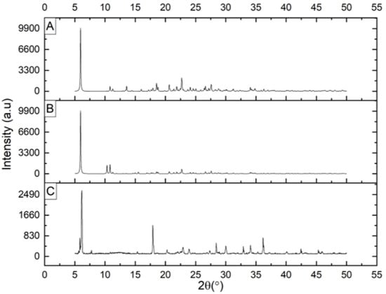 X-ray powder diffraction patterns: (A) the simulation based on the disordered structure of the doubly attached rings, (B) the simulation by removing the extra carbon atoms due to the disorder in the doubly attached rings, and (C) the experimental for (C6H11NH3)4[Ni(NCS)6]·2H2O.