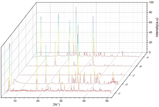 X-ray powder diffraction patterns of the reactants of cyclohexylammonium thiocyanate (A), sodium thiocyanate (B), and nickel nitrate hexahydrate (C), byproduct of sodium nitrate (D), and the experimental of (C6H11NH3)4[Ni(NCS)6]·2H2O (E).