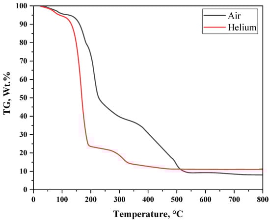 TGA analyses of (C6H11NH3)4[Ni(NCS)6]·2H2O under air (black) and helium (red).