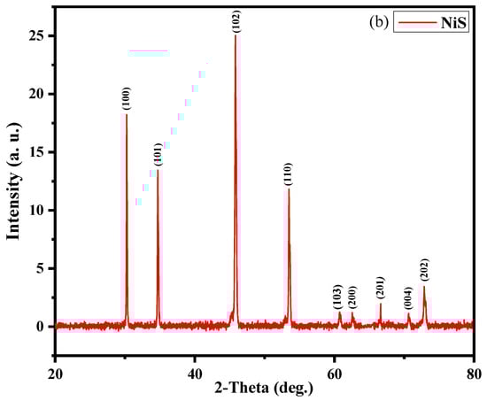 The XRD pattern in Figure 10b, obtained after the pyrolysis of (C6H11NH3)4[Ni(NCS)6]·2H2O at 500 °C under helium, matched well with the JCPDS reference 01-075-0613 of the rhombohedral α-NiS. The peaks at 2θ = 30.2, 34.7, 45.8, 53.5, 60.7, 62.6, 63.2, 66.6, and 70.5° corresponded to the crystallographic plane of (100), (101), (102), (110), (103), (200), (201), (004), and (202), respectively []. The relatively high crystallinity of the synthesized α-NiS nanocrystalline was evidenced by the relatively sharp peaks of the pattern, while their less broadening reflected large size NPs. The average crystallite size (D) was estimated to be 53.79 nm, considering the high intensity peaks: (100), (101), (102) and (110). The lattice parameters a and c were calculated according to the expression []: