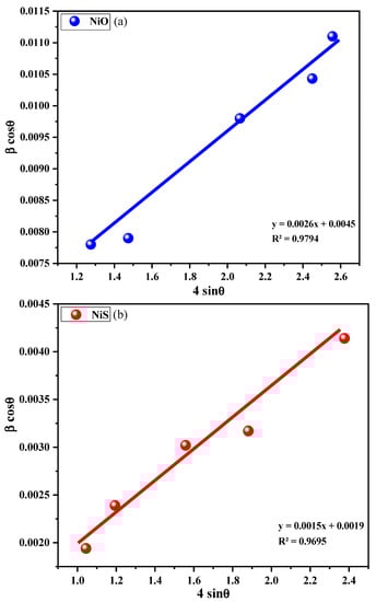 Plotting  against  (Figure 11a,b) provides linear relationship, where the slope and intercept can provide the microstrain and the crystallite size, respectively. For NiO and NiS, the crystallite sizes (D*) were 30.80 and 72.98 nm, respectively, while the microstrain (ε) values were 0.0026 for NiO and 0.0015 for NiS. The difference in the average crystallite sizes, estimated via Scherrer’s and W–H methods can be attributed to the deviation in particle size distribution averaging, as more peaks are considered in the latter [].