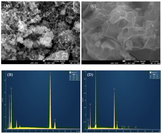 SEM (A) and EDX (B) of NiO; and SEM (C) and EDX (D) of NiS.