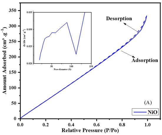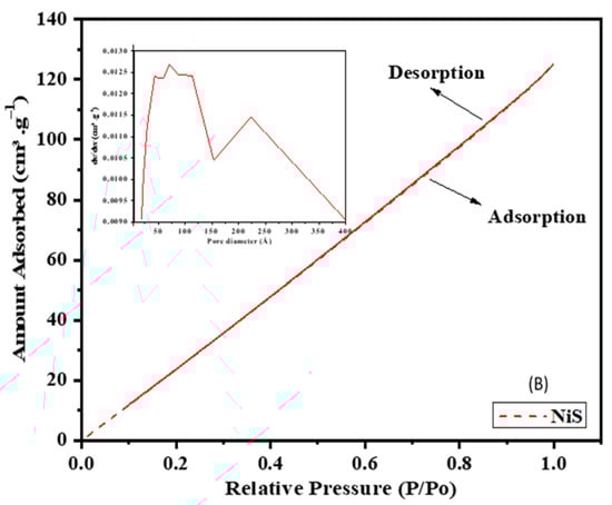 The N2 adsorption–desorption measurements, at liquid N2 temperature of 77 K, were performed to determine the specific surface area and to probe the mesoporosity and the textural characteristics of the fabricated NiO and NiS. The as-recorded adsorption–desorption isotherms are displayed in Figure 13A (NiO) and Figure 13B (NiS), where the isotherms suggested archetypal type-II sorption patterns with type-H3 hysteresis loops, indicating mesoporous nanostructures as per the IUPAC definition [], which was additionally substantiated by the Barrett–Joyner–Halenda (BJH) pore size distribution of 7.0 and 10 nm for NiO and NiS, respectively. The prominent step at the adsorption branch combined with the sharp decay of the desorption branch was concrete evidence of mesoporous material []. A sudden increase in the adsorbed N2, perceived at P/P0 greater than 0.8, is commonly linked to the capillary condensation, designating good sample homogeneity and relatively smaller pore size, as the P/P0 inflection point is influenced by the pore size. The textural properties of the nanocrystalline mesoporous NiO and NiS samples are provided in Table 7. The results demonstrated that NiO had enhanced porosity, as reflected by larger BET surface area, pore volume, and pore size. A similar dramatically increased porosity of NiO NPs was attributed to the removal of surfactant residues and hydroxyl groups out of the pore system during calcination []. For both isotherms, the adsorption and desorption isotherms completely overlapped in the low and intermediate relative pressure ranges for NiO, and the hysteresis loop subsists in the high relative pressure region (P/P0 > 0.8), which was mainly due to the presence of ink-bottle type and/or slit-shaped pores. Such ink-bottle type of pores possess a larger pore size in the bottle body, leading to the occurrence of hysteresis in the high relative pressure region []. On the other hand, no hysteresis loop was observed for NiS, indicating cylindrical closed-end pores, as per the Kelvin equation, which conjectures the similarity of the condensed phase and the uniform bulk liquid at the interface, separating the dense adsorbate region and the gas-like region, when the pore fills as when it empties. This phenomenon results in the coincidence of the desorption branch of open pores with the adsorption branch of the closed-end pores, and thus, no hysteresis loop exists [].