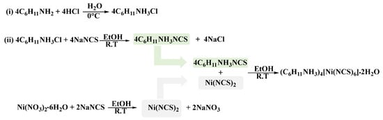 Synthesis of (C6H11NH3)4[Ni(NCS)6]·2H2O: cyclohexylammonium hexaisothiocyanatonickelate(II) dihydrate was prepared by a ligand addition reaction, where 40 mmol (6.3304 g) of C6H11NH3NCS crystals was added to [Ni(NCS)2](EtOH) under continuous magnetic stirring until the completion of the reaction, as it was indicated by the complete dissolution of C6H11NH3NCS. Green crystals of the target compound were obtained by the room-temperature evaporation of EtOH over a period of a week. The crystals were purified by dissolving them in the minimum amount of EtOH, followed by filtration of the undissolved white crystals of NaNO3 (proven by XRD analysis), and then by the room-temperature evaporation of EtOH to give 8.0174 g of the target compound crystals (95% yield). The overall yield of the multistep reactions of the new target compound was 93%. The synthesis procedure is illustrated in Scheme 1.