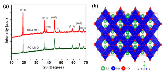 The crystallographic structure and crystallinity of the SC-LMO and PC-LMO were characterized by XRD patterns. The diffraction peaks (Figure 1a) of these two samples could be well indexed to the cubic structure in a space group (standard card, PDF#53-1237) [13], where Li, O and Mn ions occupy the 8a tetrahedral, 32e octahedral, and 16d octahedral sites (Figure 1b). The Li-ion can deintercalate from the 8a tetrahedral sites, and the 8a tetrahedral sites together with 16c octahedral sites form a 3D pathway for Li-ion diffusion. The spinel structure has a three-dimensional network of channels for fast Li-ion conduction. Moreover, the Li-ion can intercalate into the empty 16c octahedral sites in an over-lithiation state, which may cause the transition of crystal structure from cubic LiMn2O4 into tetragonal Li2Mn2O4 [26]. Notably, the SC-LMO showed relatively stronger diffraction peaks than PC-LMO, indicating a higher degree of crystallinity in SC-LMO than PC-LMO.