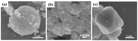 SEM images of (a,b) polycrystalline LiMn2O4 and (c) single-crystal LiMn2O4.