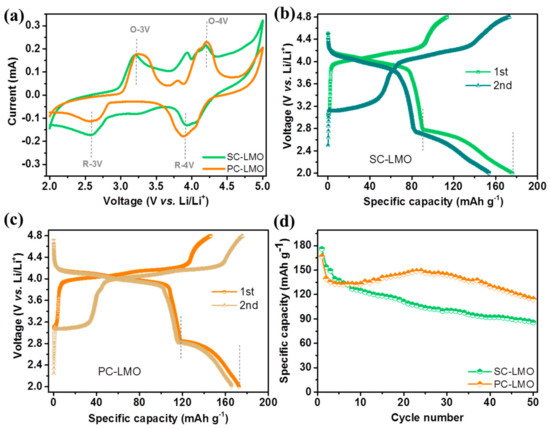 Figure 3b,c show the GCD profiles of SC-LMO and PC-LMO cathodes at 50 mA·g−1 in a wide voltage range of 2.0–4.8 V vs. Li/Li+. During the first charging process, both SC-LMO and PC-LMO cathodes exhibited two distinct voltage plateaus at ~4.1/4.2 V vs. Li/Li+. The first discharge capacities of SC-LMO and PC-LMO cathodes at a current density of 50 mA·g−1 were 178 and 172 mA·h·g−1, respectively. Clearly, the SC-LMO had a much higher specific capacity (88 mA·h·g−1) than PC-LMO (56 mA·h·g−1) in the 3 V region, which is consistent with the CV tests. This indicates that extra Li-ion storage at the 16c octahedral vacancies in spinel LiMn2O4 [13] was more easily activated in single-crystalline particles than in polycrystalline secondary particles.