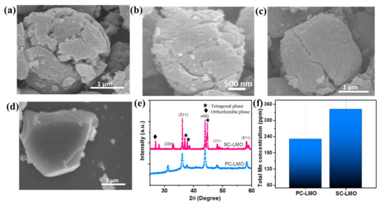 The morphology of the as-synthesized LiMn2O4 samples was examined by SEM. As exhibited in Figure 2a, the morphology of PC-LiMn2O4 was microspherical with a rough surface. The diameter of the microsphere was in the range of 2.0–2.5 μm. The enlarged SEM image indicated that the spherical particle was densely composed of numerous small primary particles with sizes in the range of 100–200 nm (Figure 2b). In contrast to the spherical-shaped polycrystalline particles consisting of small grains, SC-LMO had a relatively regular polyhedral shape with a smooth surface and clear edges. SC-LMO had an average particle size of ~2.0 μm.
