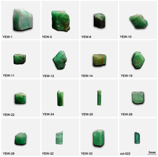 Fifteen rough emeralds from Dayakou (China) and one emerald crystal from Colombia (col-022) were collected for this study (Figure 2). Dayakou samples consist of crystal fractions and euhedral columnar single crystals. Sized from 2 to 13 mm, these crystals are translucent to opaque and their colors cover various shades of green. All the Dayakou emeralds were cut into thin sections parallel to c-axis with the thickness of 1 mm and polished with double parallel sides. The Colombian sample is a polished crystal cut parallel to the c axis with a weight of 0.82 ct.