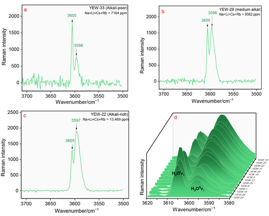 In the region of 3500–3700 cm−1, the Raman shifts of ν1 modes of type I and II H2O can be observed at 3605 cm−1 (P1) and 3596 cm−1 (P2), respectively. Three distinct spectral patterns of channel water molecules in Dayakou emeralds are displayed in Figure 3. These are: “alkali-poor” (Figure 3a), “medium alkali” (Figure 3b), and “alkali-rich” (Figure 3c) patterns, among which the “alkali-rich” pattern is most common.