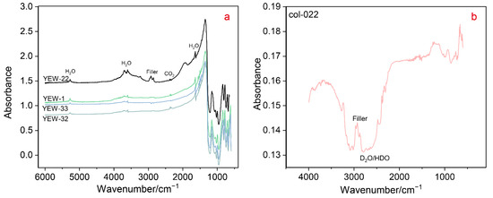 (a) IR spectra of Dayakou samples in the range of 6000–600 cm−1; (b) IR spectrum of Colombian sample in the region of 4000–400 cm−1.