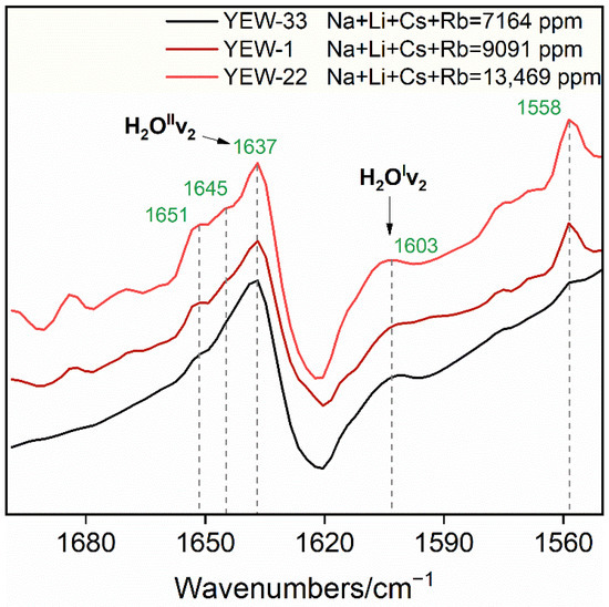 As shown in Figure 5, IR bands at 1603 and 1637 cm−1 can be ascribed to H2OIν2 and H2OIIν2, respectively. Besides, the 1558 cm−1 and 1651 cm−1 bands commonly appear in all Dayakou samples, while the 1645 cm−1 band is more obvious in samples with high alkali content. These bands were referred to as the ν2-related modes of type I water [25].