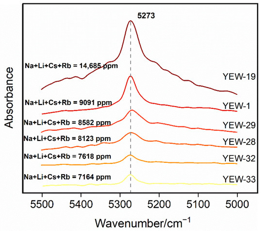IR band at 5273 cm−1 is likely to be the combined frequency of ν2 and ν3 modes. As shown in Figure 7, there is a significant positive correlation between the alkali content and the peak intensity. In previous studies, the 5273 cm−1 band was commonly ascribed to type I H2O according to the orientation of measurement [14,23,29], but occasionally related to type II H2O [24,34]. Since the obvious positive correlation observed in Figure 7, this band is assigned to H2OIIν2+ν3 here.