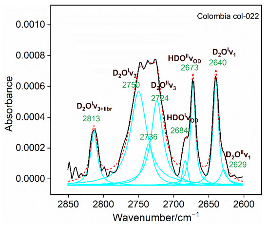 IR spectra of D2O and HDO molecules in Colombian sample in the region of 2600–2850 cm−1. Experimental spectrum = black solid line, fitted peaks = cyan solid line, cumulative fit = red dash line.