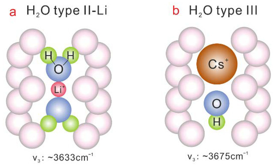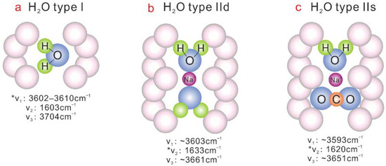 H2O molecules in emerald channels were preliminarily classified as two types: Type I and II, and commonly recognized by infrared (IR) and Raman spectroscopies [1,11,15,16,17,18,19]. Both types of H2O have three vibrational modes, which are symmetric stretching (ν1), antisymmetric stretching (ν3), and bending (ν2) modes. Type I H2O exists at 2a site with the twofold axis perpendicular to c-axis (Figure 1a). Type II H2O exists near an alkali ion (Figure 1b,c), and its orientation is changed from perpendicular to parallel to c-axis due to the electrostatic attraction between the charged cation and the oxygen of H2O molecule. Recently, there have been some more detailed studies on the subtypes of type II H2O. For example, [4] firstly proposed singly (IIs) and doubly (IId) coordinated type II water molecules related to Na on the basis of the IR bands of ν1 and ν2 modes. This classification was further updated by [20,21,22]. Since Na+ is the dominant alkali ions in the channel of natural emerald and the other cations such as Li+ and Cs+ are comparably subordinate, the coordination of H2O molecules with Li+ or Cs+ has not been carried out yet.