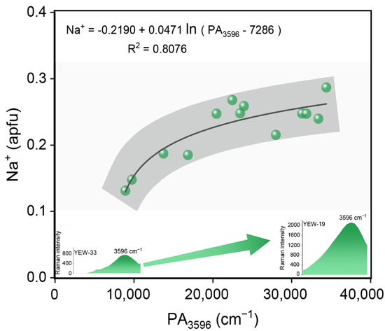 Figure 3a–c reveal that the Raman spectrum patterns of the channel water molecules in emeralds are controlled by the alkali content, especially the dominant Na content. At present, many researchers quantitatively linked alkali cations with water, and various empirical equations using Na content to evaluate the total channel water content have been proposed [39,40,41], and the preferred equations are: