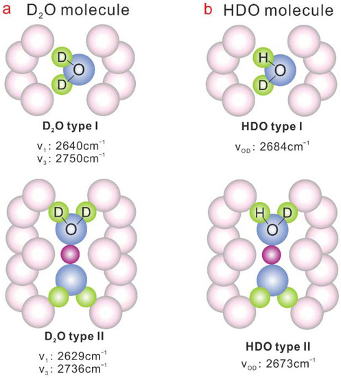 Infrared spectroscopy is a widely used method to characterize the vibrational frequencies of water molecules in the emerald channel. The difference in frequencies between type I and type II H2O might be due to the coupling cations [4,8]. Furthermore, the difference in bond lengths between Na+ and oxygen atoms of water molecules results in the different IR absorption bands of type IIs and IId H2O. Extensive research has recorded the IR bands corresponding to the three vibration modes of type I, IIs and IId H2O [1,2,4,7,9,11,14,16,17,18,19,20,21,22,23,24,25,26,27,28,29,30,31,32,33,34,35]. However, there are currently no consensuses on the ν1 band of type I H2O and the ν3 band of type IIs H2O. Additionally, the IR bands of H2O related to Li+ or Cs+ have not been determined.