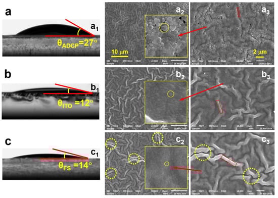 The reason we chose ADCP to modify the surface properties of the substrate is that the ADCP layer has no physical or chemical reactions with the DMF solutions. This can be confirmed by our test experimental results in Figure S1, where the optical microscopic images of an ADCP grating with a period of 4 μm before and after it was immersed in DMF were measured. No changes can be observed in the grating structure due to its interaction with DMF. Therefore, the ADCP-coating on the FS substrate is not destroyed and there is no contamination of MAPbBr3 by ADCP. All these substrates have a thickness of about 1 mm and an area of 15 × 15 mm2. We define these three types of substrates as the ITO substrate, the FS substrate, and the ADCP substrate, respectively, for the convenience of discussion in the following sections. Figure 1a–c shows the characterization of the surface properties of the three substrates and the microscopic properties of the spin-coated MAPbBr3 film on them. Figure 1(a1,b1,c1) shows the contact angle measurements for the MAPbBr3/DMF solution on the ADCP, ITO, and FS substrates, respectively. The corresponding contact angles were measured to be θADCP = 27°, θITO = 12°, θFS = 14°, implying the strongest wetting of the solution was on the ITO substrate and the weakest was on the ADCP. However, the difference is very small between ITO and FS. Such wetting properties directly influence the crystallization properties of MAPbBr3 as it is spin-coated onto these substrates. Figure 1(a2,b2,c2) shows scanning electron microscope images measured on the samples with ADCP, ITO, and FS substrates, respectively, and Figure 1(a3,b3,c3) shows the enlarged views. The insets in Figure 1(a2,b2,c2) show a local-area view, revealing the crystallization details of MAPbBr3 on these three substrates. Furthermore, pinholes and cracks can be clearly observed in Figure 1(a2,a3). The corresponding mechanisms for the formation of such structures can be understood by recent investigations in [22].