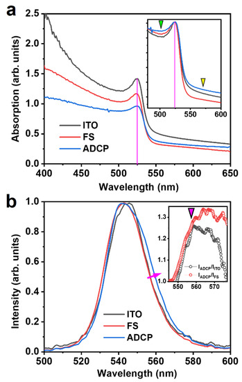 (a) Absorption spectra of MAPbBr3 coated on substrates of ADCP, ITO, and FS. Inset: normalized comparison in a selective spectral range. (b) PL spectra of MAPbBr3 on different substrates. Inset: calculated spectra by IADCP(λ)/IITO(λ) and IADCP(λ)/IFS(λ).