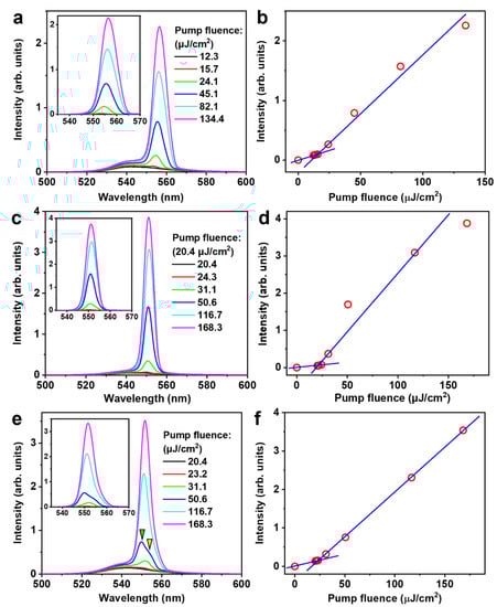 In the investigation on the random lasers, we used 150-fs laser pulses at 400 nm as the pump; these are produced by frequency-doubling of 800-nm pulses from a Ti:sapphire amplifier and have a repetition rate of 1000 Hz. An optical attenuator was placed between the pump laser and the samples of MAPbBr3-coated substrates, so that the pump fluence could be adjusted continuously. A fiber spectrometer was mounted in front of the front surface of the sample so that the detection avoids the reflection of the pump laser beam. Random lasing spectra are measured at different pump fluences, as shown in Figure 3.