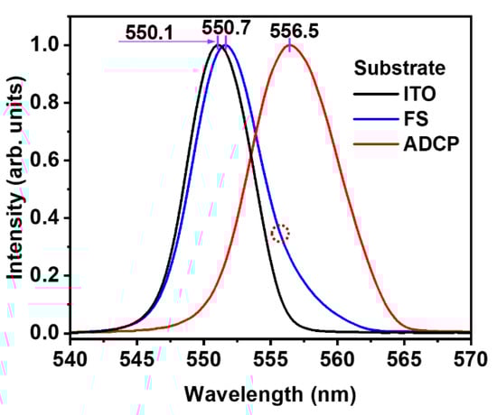 In Figure 4, we make a more detailed comparison between the lasing spectra measured on MAPbBr3 on ADCP, ITO, and FS substrates for pump fluences of 134.4, 168.3, and 168.3 μJ/cm2, respectively. The corresponding peak wavelengths are located at 551.1, 551.7, and 556.5 nm, respectively. The ADCP substrate supports an almost completely separate lasing spectrum from the ITO and FS substrates, which is also the broadest among the three. Although the samples based on the ITO and FS substrates exhibit a quite similar surface morphology, the FS substrate supports a slightly red-shifted and broadened lasing spectrum. More importantly, for the FS substrate, we can still identify an additional feature on the falling edge of the lasing spectrum, as highlighted by a dashed circle, which agrees well with our discussions above regarding the mode competition effect. Therefore, the surface morphological performance of the spin-coated MAPbBr3 film, as well as its spectroscopic response, is very sensitive to the material properties of the substrate.