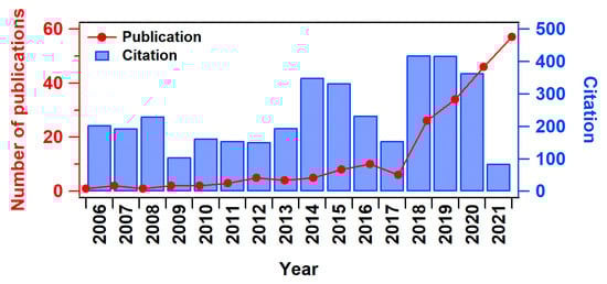 Number of reported publications on magnetron-sputtered HEFs. The histogram shows the number of the articles from 2006 to December 2021. The red curve displays the citation number of the articles per year. The results are plotted according to statistical analysis from the Scopus website.