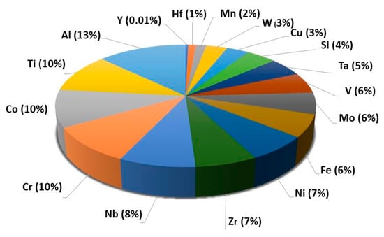 Compared to conventional alloys, coatings are of considerable interest in the field of materials development. Since 2004, a new approach was reported that involved developing high-entropy alloys (HEAs), which can be an alternative solution to improve the physical and the chemical properties of multi-element alloys. HEAs are defined as an alloy of at least five elements with an atomic percentage varying from 5 at.% to 35 at.%. Since their invention, several names have been reported in the literature, such as complex concentrated alloys [1], multi-principal element alloys [2], multi-component alloys [3] and compositionally complex alloys [4]. In addition, four characteristic effects are reported and known for HEAs: high entropy, severe lattice distortion, slow diffusion and the cocktail effect. All the cores effect are reported and explained in detail by Yeh et al. in reference [5]. Combining the four effects leads to HEAs with interesting physical and chemical properties. Three different structures of HEAs—amorphous, intermetallic compounds or solid solutions—have been reported. The solid solution is either face-centered cubic (fcc), body-centered cubic (bcc) or hexagonal close-packed (hcp). Moreover, intensive research always focuses on the development of coatings with excellent properties, such as high hardness, good wear resistance [6], outstanding thermal stability [7] and excellent oxidation and corrosion resistance [8,9]. Due to those promising properties, HEFs show great potential for engineering fields, such as aerospace materials [10], catalysts [11], metallurgical materials [12] and materials for nuclear applications [13].