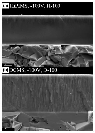 Cross-sectional morphology of (a) HiPIMS-deposited and (b) DC magnetron sputtering-deposited (AlCrTiVZr)N films. Figure reproduced and modified with permission of ref. [56]. Copyright 2021 Applied Surface Science.