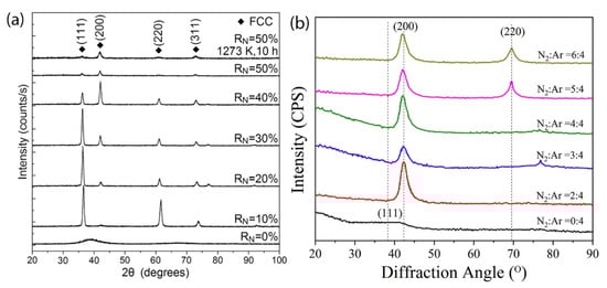 In the case of HENF investigations, without nitrogen, most reported films deposited by magnetron sputtering are amorphous. An example is shown with XRD diffractograms from reference [20], which are presented in Figure 5a. Figure 5b shows a large peak, as reported in reference [76], indicating the amorphization of the film without the nitrogen. However, an fcc solid solution was obtained upon increasing the nitrogen content, as presented in Figure 5a,b. The adsorption of the nitrogen atom in interstitial sites promoted the phase transformation of the film, resulting in the crystalline structure. Some analyses reported that HENF exhibit fcc phased solid solution due the formation of binary nitrides having the same structure. However, this rule cannot be generalized. Some HEFs remain amorphous, even after increasing the nitrogen content, such as in the case of NbTiAlSiZr [79], AlCoCrNi [27], FeCoNiCuVZrAl [68] and AlBCrSiTi [84] nitrides films. Liu et al. explain that the amorphization tendency could result from the low enthalpy of the mixed elements, the difference between the depositing temperatures and also from a large solid/liquid interface energy [68]. On the other hand, other HENFs present a mixed bcc and fcc structure after increasing the nitrogen content, as in the case of (AlCoCrCu0.5FeNi)N [78] and (ZrTaNbTiW)N [81]. The authors explain that the formation of these mixed phases is caused by increasing the nitrogen because only some part of the alloys form nitrides. Other element, such as Nb and W, are bcc and promote the formation of a bcc phase.