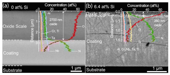 SEM cross-section of the (AlCrNbTaTi)N without Si (a) and with 6.4 at.% Si (b) after exposure to ambient air at 850 °C for 100 h. Figure reproduced with permission ref. [17]. Copyright 2021 Surface and Coatings Technology (open access).