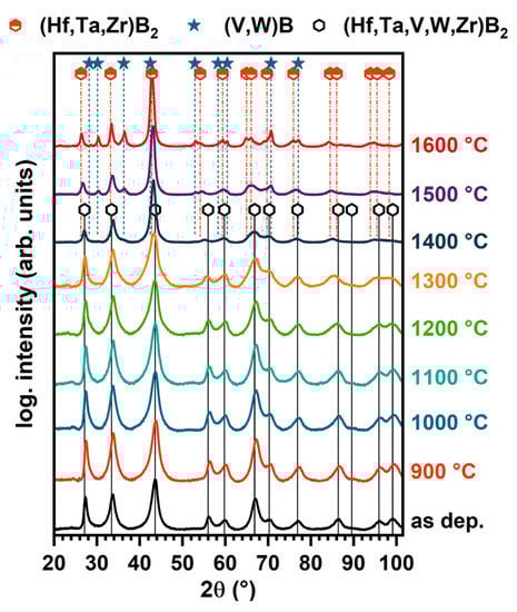 X-ray diffraction patterns of vacuum-annealed (HfTaVWZr)B2 at different temperatures. Figure reproduced with permission ref. [98]. Copyright 2020 Acta Materialia.