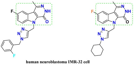 Pyridazino[4,5-b]indole derivatives have therapeutic effects as they act as thromboxane A2 synthetase inhibitors [7], antihypertensive MAO inhibitors [8], antihistaminic and HIV-1 reverse transcriptase inhibitors, antiarrhythmics [9], phosphatidylinositol 3-kinase (PI3K) inhibitors [10], blood platelet aggregation inhibitors, inotropics [11], serotonin antagonists [12], and anxiolytics [13], and they have antimicrobial and antiproliferative effects in different cell types [14]. Pyridazino[4,5-b]indole derivatives also have inhibitory effects against cancer cells such as human neuroblastoma IMR-32 cell lines (Figure 1), hepatocellular carcinoma Huh-7, human primary glioblastoma U-87, prostate carcinoma PC3, colorectal adenocarcinoma Caco2, breast cancer cells MDA-MB-231, colorectal carcinoma HCT-116, one normal cell line (fibroblasts), lung carcinoid NCI-H727, and MCF 7; additionally, they inhibit enzymes in cancer cells [15,16,17,18,19]. Moreover, pyridazino[4,5-b]indole derivatives provide powerful therapeutic effects for different diseases related to acute and chronic inflammation [20], neuroinflammation, and neoplastic progression [21].