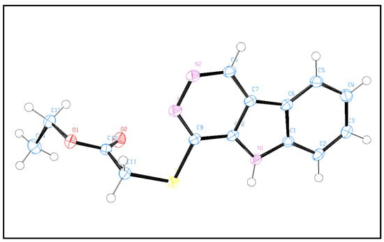 Yield: 83%, m.p. 218–219 °C. 1H NMR (600 MHz, DMSO-d6): δ 1.19 (t, 3 H, J 7.1 Hz, CH3); 4.14 (q, 2 H, J 7.1 Hz, CH2); 4.40 (s, 2 H, SCH2); 7.41 (dd, 1 H, J 7.3, 7.7 Hz); 7.65 (dd, 1 H, J 7.4, 7.9 Hz); 7.72 (d, 1 H, J 8.2 Hz); 8.33 (d, 1 H, J 8.0 Hz); 9.74 (s, 1 H); 12.48 (s, 1 H, NHind). 13C NMR (150 MHz, DMSO-d6): δ 14.5 (CH3), 31.76 (SCH2), 61.55 (OCH2), 113.33, 117.34, 121.90, 122.51, 129.18, 133.57, 139.06, 142.76, 145.50, 169.09 (C=O) (see in Supplementary Materials). Elemental analysis calculated for [C14H13N3O2S]: C, 58.52; H, 4.56; N, 14.62; O, 11.14; S, 11.16 vs. found: C, 58.67; H, 4.59; N, 14.53; S, 11.22.