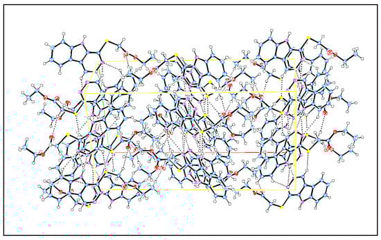 A single crystal of compound 6 was grown via the slow evaporation of ethanol. Crystal data showed that the compound had an empirical formula of C14H13N3O2S and crystallized in an orthorhombic crystal system (Pccn space group) (Figure 2). Molecules were stabilized in a 3D molecular packing network by strong, classical intermolecular hydrogen bonding, and the most important bond was N(1)-H(1)…N(2) (Figure 3).