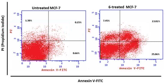 To study the apoptotic and necrotic activity of the investigated compound, flow cytometric examinations of Annexin V/PI staining in treated and untreated MCF-7 cells with compound 6 (IC50 = 12 mM, 48 h) were conducted.