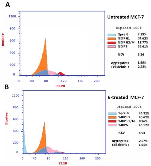 Histograms of DNA content using flow-cytometry-aided cell cycle analyses of (A) untreated and (B) 6-treated MCF-7 cells (IC50 = 12 μM, 48 h), with the percentage of cell population at G1, S, and G2/M phases.