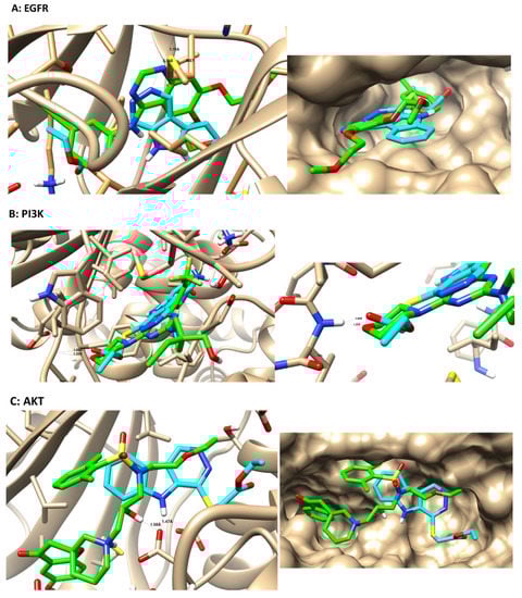 Binding disposition and ligand–receptor interactions between the cocrystallized ligand (green-colored) and docked compound 6 (cyan-colored) inside the three proteins of EGFR (PDB = 1M17), PI3K (5JHB), and AKT (PDB = 3QKK). The 3D images were obtained using Chimera. Compound 6 and the cocrystallized ligands are compared for highlighting the interaction binding mode inside the protein active sites and the lipophilic interactions with lipophilic amino acids.
