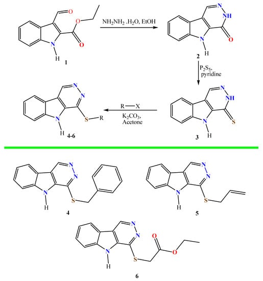 The reaction of hydrazine hydrate with ethyl 3-formyl-1H-indole-2-carboxylate (i.e., ester 1) in ethanol afforded 3,5-dihydro-4H-pyridazino[4,5-b]indol-4-one (i.e., substance 2). Thionation of substance 2 to a thione (i.e., compound 3) was conducted using P2S5 in pyridine [34,35]. The structure of compound 3 was deduced from 1H and 13C NMR spectra, which showed an indole NH signal at 12.54 ppm and a pyridazine NH signal at 14.47 ppm. A thione tautomer was deduced from a thiocarbonyl (C=S) signal at 169.24 ppm. Alkylation of thionated compound 3 with benzyl bromide, allyl bromide, and ethyl chloroacetate was achieved in the presence of potassium carbonate and acetone. S-alkylation was confirmed from 13C NMR signals found at 33.34, 32.22, and 31.76 ppm in alkylated products 4–6, respectively (Scheme 1).