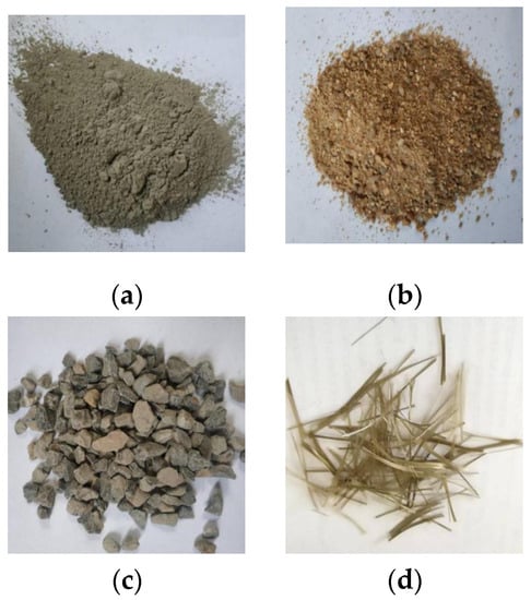 Materials used in the test. (a) Cement, (b) manufactured sand, (c) crushed stone, and (d) BF.