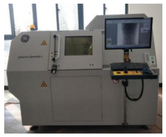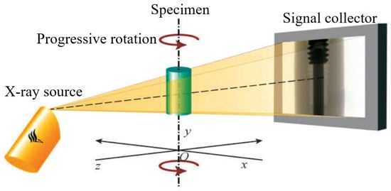 The basic principle of CT detection technology is to scan the sample to be tested with an X-ray, as shown in Figure 5. The X-ray is transmitted through the sample and received by the detector, and then the optical signal is converted into a high-resolution image reflecting the component information of the sample. When X-rays pass through specimens with different densities, X-rays will be attenuated to varying degrees due to the refraction and reflection of light. The attenuation of X-rays follows the Lambert–Beer Law [,]: