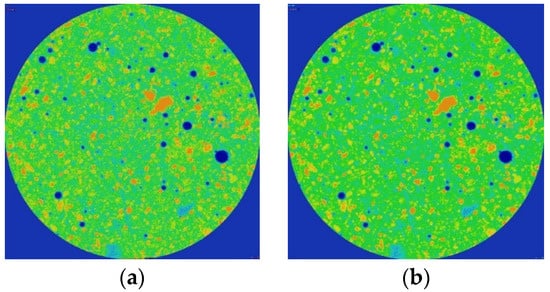 The CT scanning experimental equipment is a Phoenix|tomex|s 3D computed tomography system from German GE Company, as shown in Figure 3, and the maximum voxel resolution is 0.3 μm. The maximum scanning voltage is 180 kV and the maximum power is 15 W []. Before scanning the sample, we placed the fiber concrete sample on the scanning turntable, set the scanning parameters, and then started scanning to obtain the basic data. After scanning, the device obtained horizontal and vertical slices, as shown in Figure 4, and the pixel size is 1721 px × 1721 px, while the thickness of slice is 0.0059 mm.