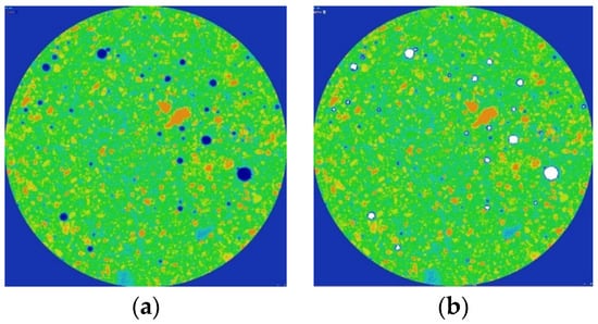 Comparison of slice images before and after threshold segmentation. (a) Slice image before threshold segmentation processing and (b) slice image after threshold segmentation processing.