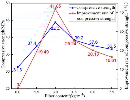 Through the compression test, the compression strength curves of six fiber dosages were obtained, which were in the shape of a parabola [,], with the opening facing down, as shown in Figure 8. When the fiber dosage was 3 kg/m3, the peak compression strength was 44.4 MPa, which is much higher than that of plain concrete, and the increased rate of compression strength was 41.85%. This shows that the fiber plays a bridging role with the concrete matrix, enhances the bonding force between the matrix, and greatly improves the mechanical properties. With the increase in fiber dosage, the compression strength decreased to varying degrees. Excessive addition will weaken the gain effect of fiber, but the decline curve is gentle, and when the fiber dosage was 7.5 kg/m3, the compression strength was still greater than that of ordinary concrete with zero fiber dosage.
