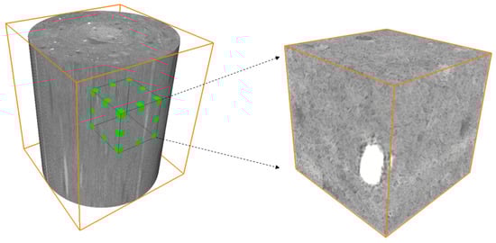 In this paper, the volume of all the samples used is larger than 50 mm × 50 mm × 50 mm, and the number of slices obtained by CT scanning is more than 1000. Due to the limitation of computer operation capacity and taking into account the representativeness of samples, it was necessary to select representative volume units for subsequent calculation. The most commonly used method for selecting representative volume units is to select different positions arbitrarily in the sample, with the selected position as the center, take a series of sub volumes with side length as shown in Figure 9, and calculate their porosity. The volume unit when the pore distribution curve reaches stability is the representative volume unit as shown in Figure 10.