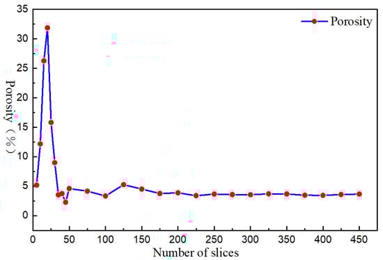 It can be seen from Figure 10 that when the number of slices was in the range of 0~200, the porosity results corresponding to different number of slices fluctuated widely, so it was impossible to select an accurate value as the porosity of the tested piece. When the number of slices exceeded 200, the porosity of the series of sub-volume units began to stabilize, so it could be used as a representative volume unit, and its relevant pore characteristics represented the overall basalt fiber concrete specimen. The subsequent analysis could, thus, be carried out on this scale.