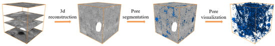 The spatial structure of pores in porous media is complex and difficult to describe with clear parameters. Therefore, it is very important to construct a three-dimensional real meso-model of porous media, which can be used to analyze the spatial distribution characteristics of pores from the meso-scale. Three-dimensional reconstruction technology refers to reproducing the original three-dimensional image of the detected object by performing segmentation processing, such as boundary recognition, on a series of two-dimensional images, and using visual processing to display the three-dimensional spatial structure distribution and morphological characteristics of BFRC [,,]. In this paper, the 3D model was obtained after the 3D reconstruction of the series of binary images which were segmented according to the above threshold, allowing a series of operations, such as pore segmentation, to be carried out. Figure 11 shows the general process of reconstructing a three-dimensional model through two-dimensional CT scanning.