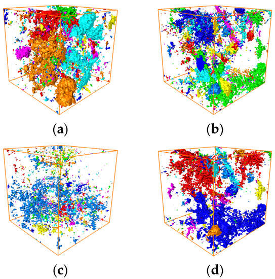 Using the command module in Avizo software [,], each pore of BFRC numerical model was labeled with a unique label, that is, each pore was marked. The marked pore model enabled the quantitative analysis of the spatial distribution of pores. The marked pore model is shown in Figure 12 It can be seen that each color represents pores of different scales, which intuitively shows the state of pores in the concrete matrix. At the same time, we can quantitatively analyze the pore space structure parameters, obtain statistical data, and draw the histogram of the pore diameter, pore area, and pore volume frequency distribution, as shown in Figure 13.